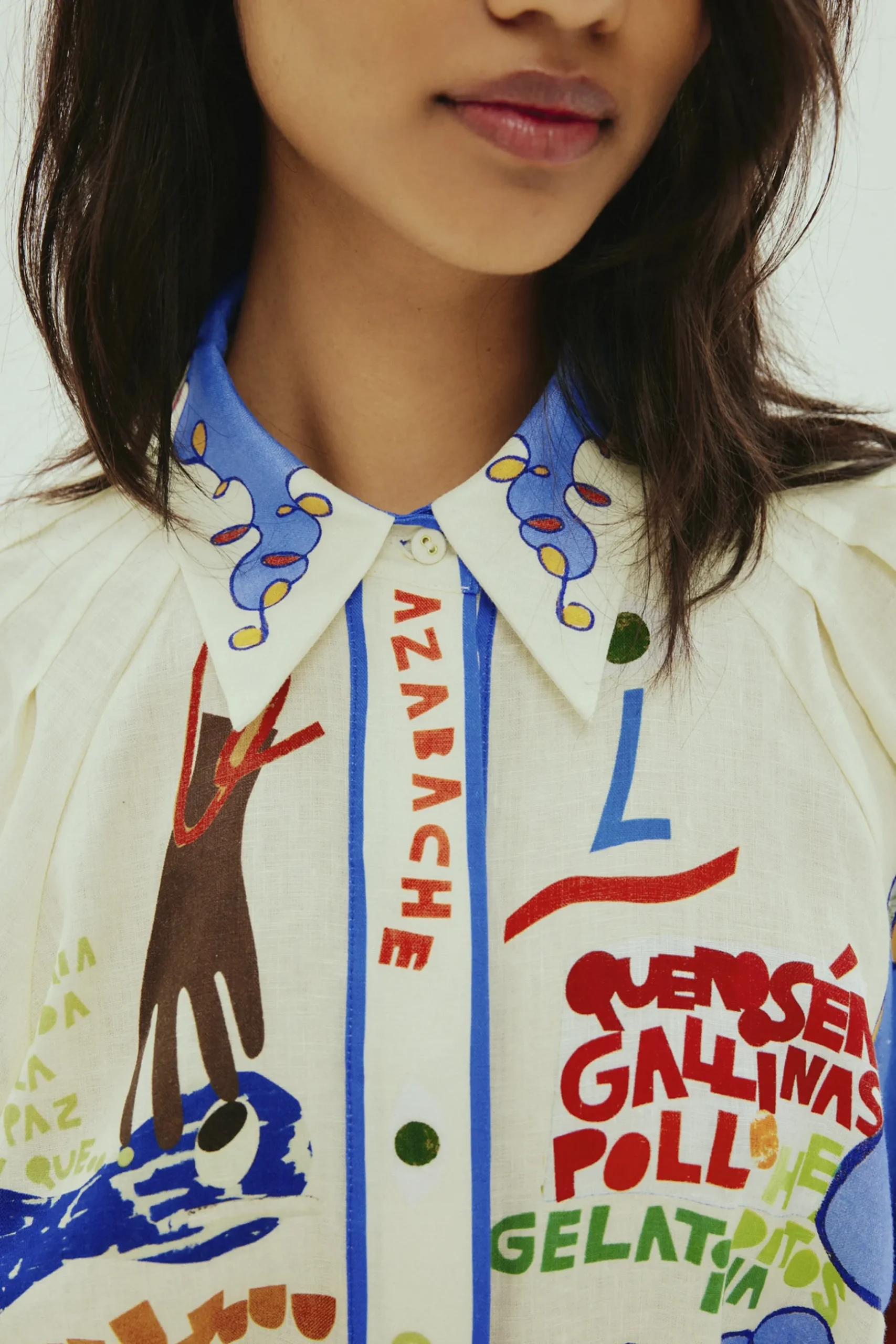 Introducing the Alemais Nadia Mini dress |a collaboration with artist Nadia Hernandez. This straight silhouette features a pointed collar, gathered sleeve and a concealed placket with shell buttons. Its lined skirt and in-seam pockets add practicality, while the self-tie belt adds a touch of elegance. Experience art and fashion in one luxurious piece. Composition: 100% European Flax Linen Care Instructions: Refer to the label attached to the garment for detailed washing instructions. Model is 183cm and wears a size AU08.