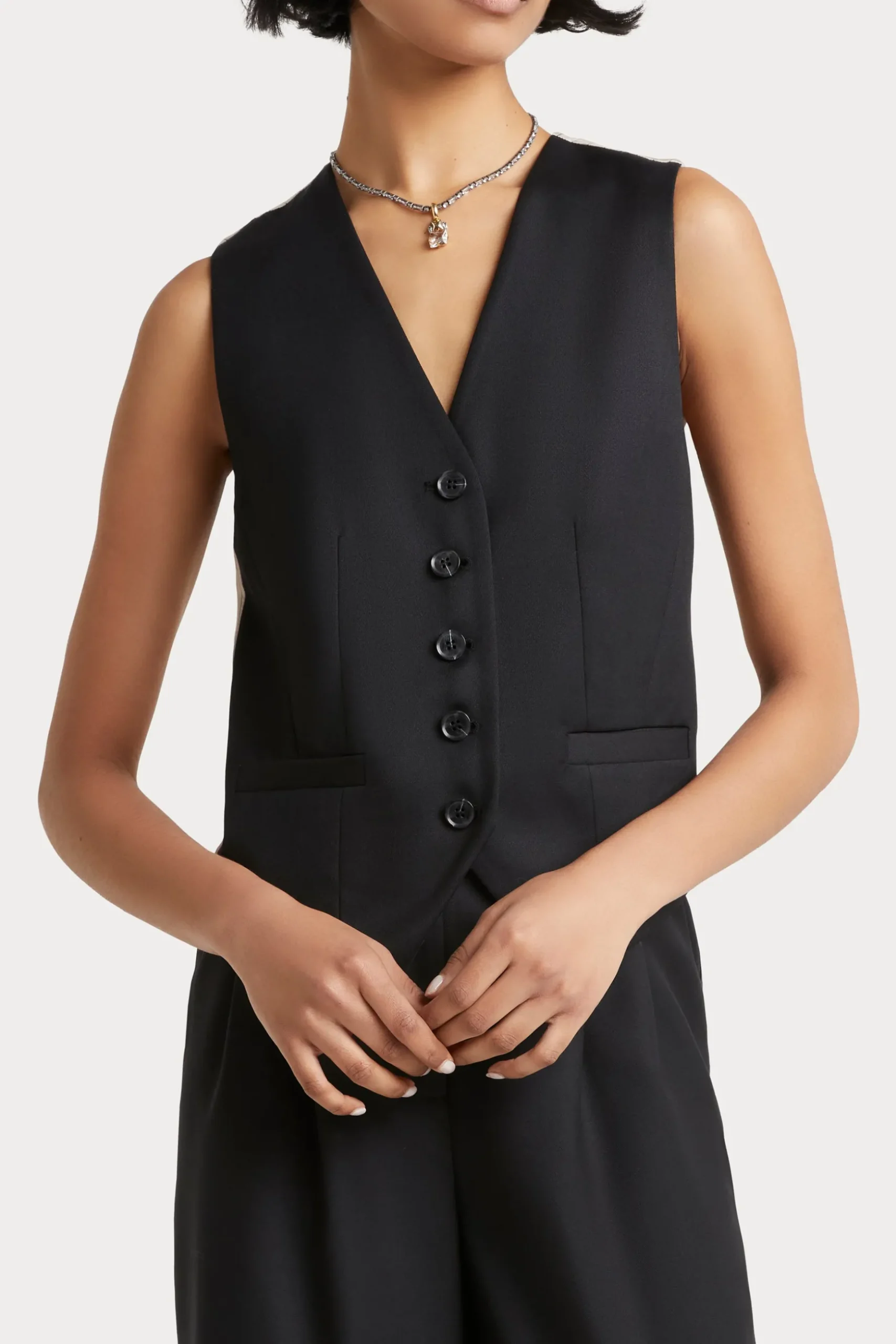 |Tailored vest |Black front with pinstripe back detail |Adjustable D-ring belt at the back |Single breasted button down |Mock welt pockets Composition 30%Wool, 67%Poly, 3% Lycra Care Dry clean Studio model is 177cm tall and wears a AU8