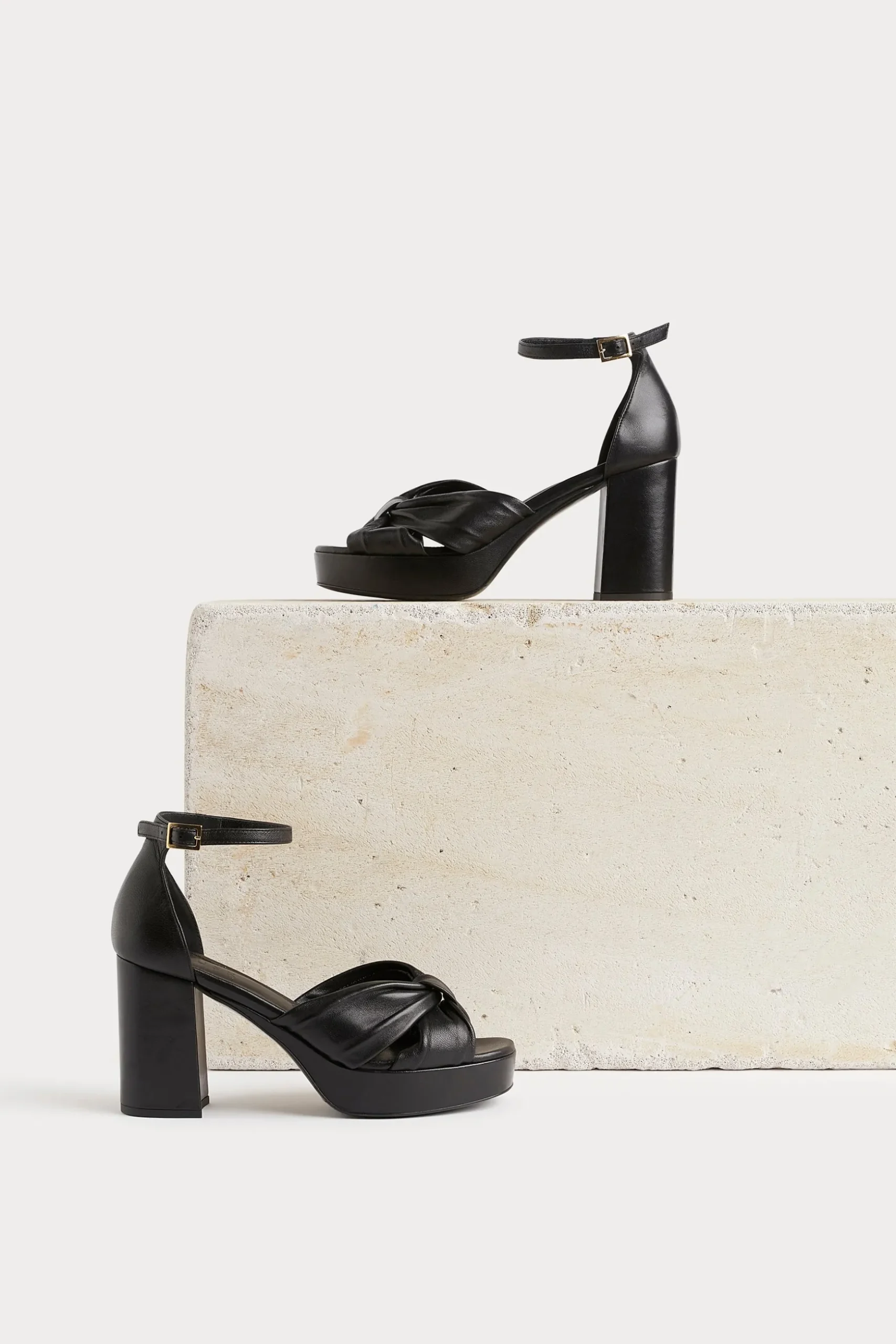 Handcrafted in Italy, the open-toe Uma Platform available in gold snake metallic and nappa black leather. The silhouette includes a knot detail that crossover the toes and an ankle strap. Heel height: 9cm Platform height: 2.5cm Composition: Leather sock / Leather lining Made in Italy.