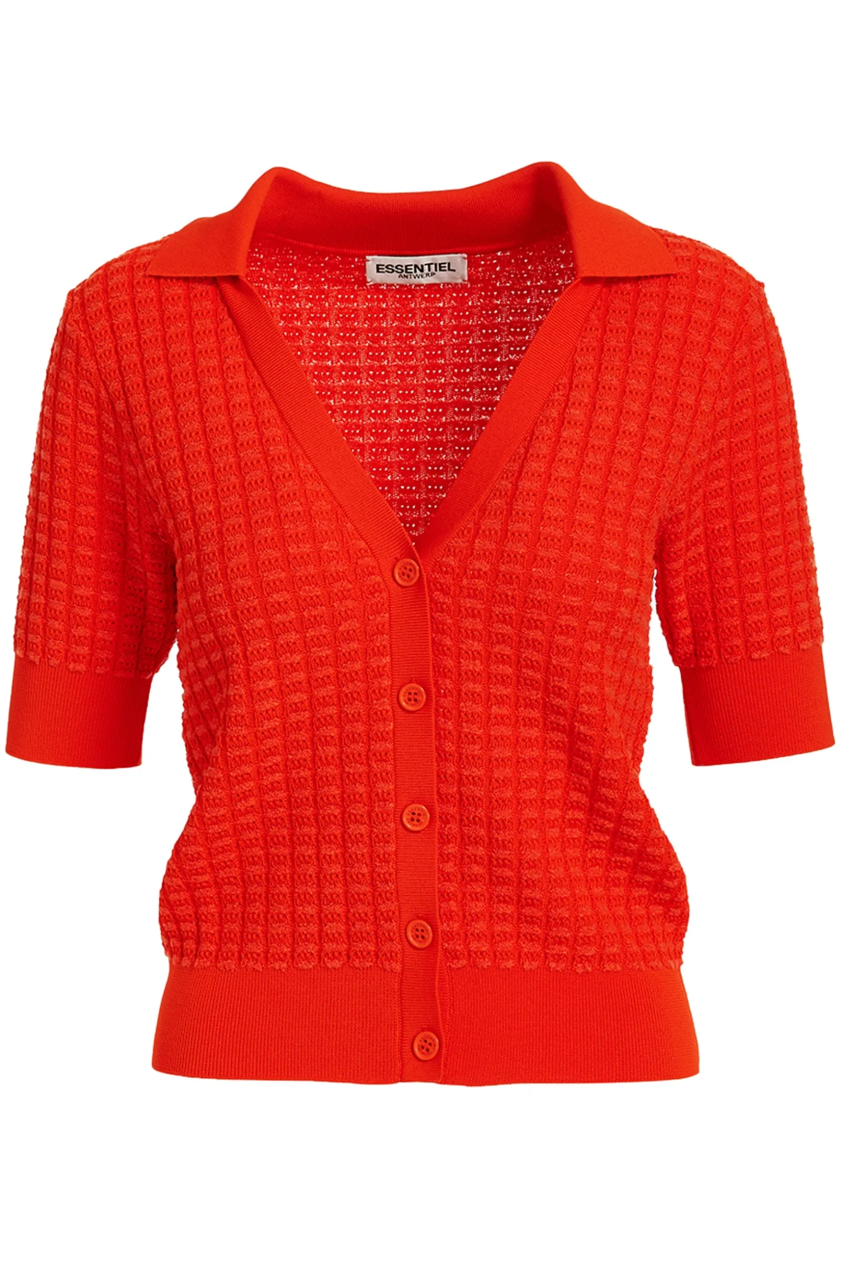 The Fabio Top by Essentiel Antwerp is a relaxed and lightweight knitted top, featuring a pointed collar, v-neckline, and short sleeves with a charming pointelle design. Create a casual look by pairing it with denim and sandals. Perfect for a laid-back ensemble. Composition: 37% Viscose / 36% Recycled Polyester / 18% Acrylic / 9% Nylon. Care instructions: Refer to the garment for detailed washing instructions