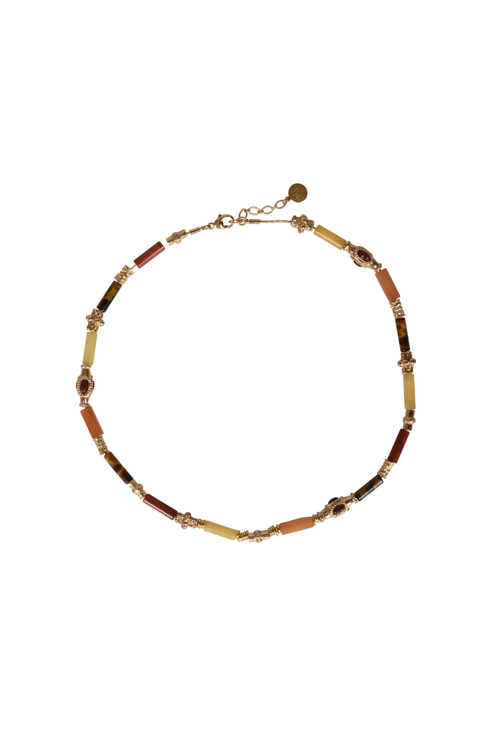 Gold plated necklace, composed of various glass and Amethyst gemstones beads and adorned with gold plated rings set with colored cabochons. Composition: Gold Plated Dimensions: 41.5cm |44.5cm length x 0.8cm width Care instructions: Avoid wearing jewellery whilst swimming or bathing. Avoid having jewellery come into any contact with chemicals. Made in France