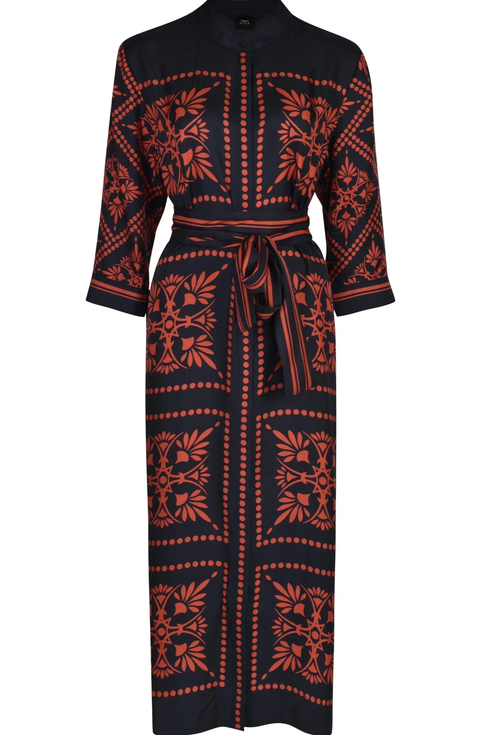 |Cut in a silk twill |Neru collar with a self covered button |3/4 sleeve with stripe cuff detail |Midi length |Featuring a placement print with dot border detail Composition 65% Viscose / 35% Nylon Care Dry clean Studio model is 177cm tall and wears a AU8