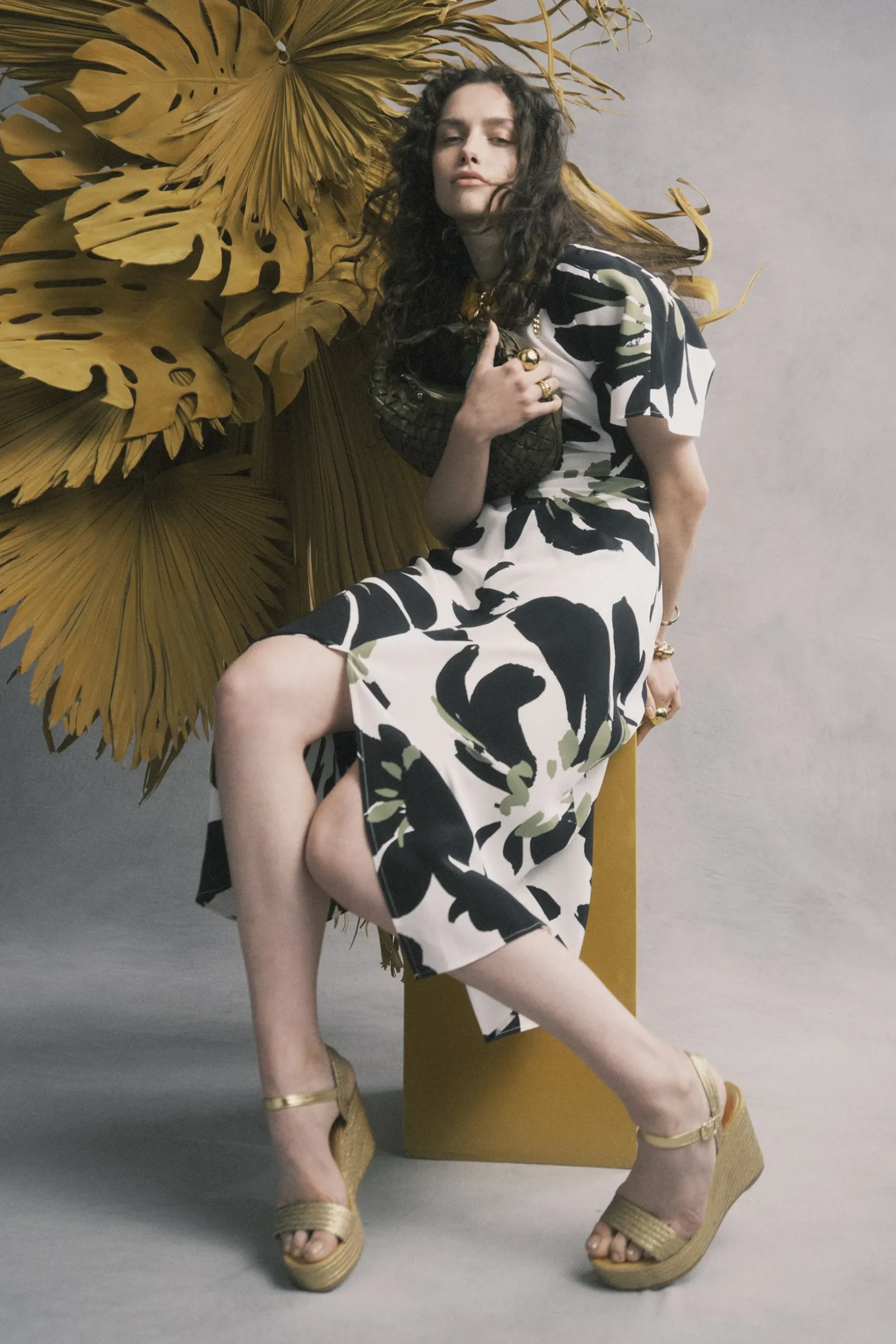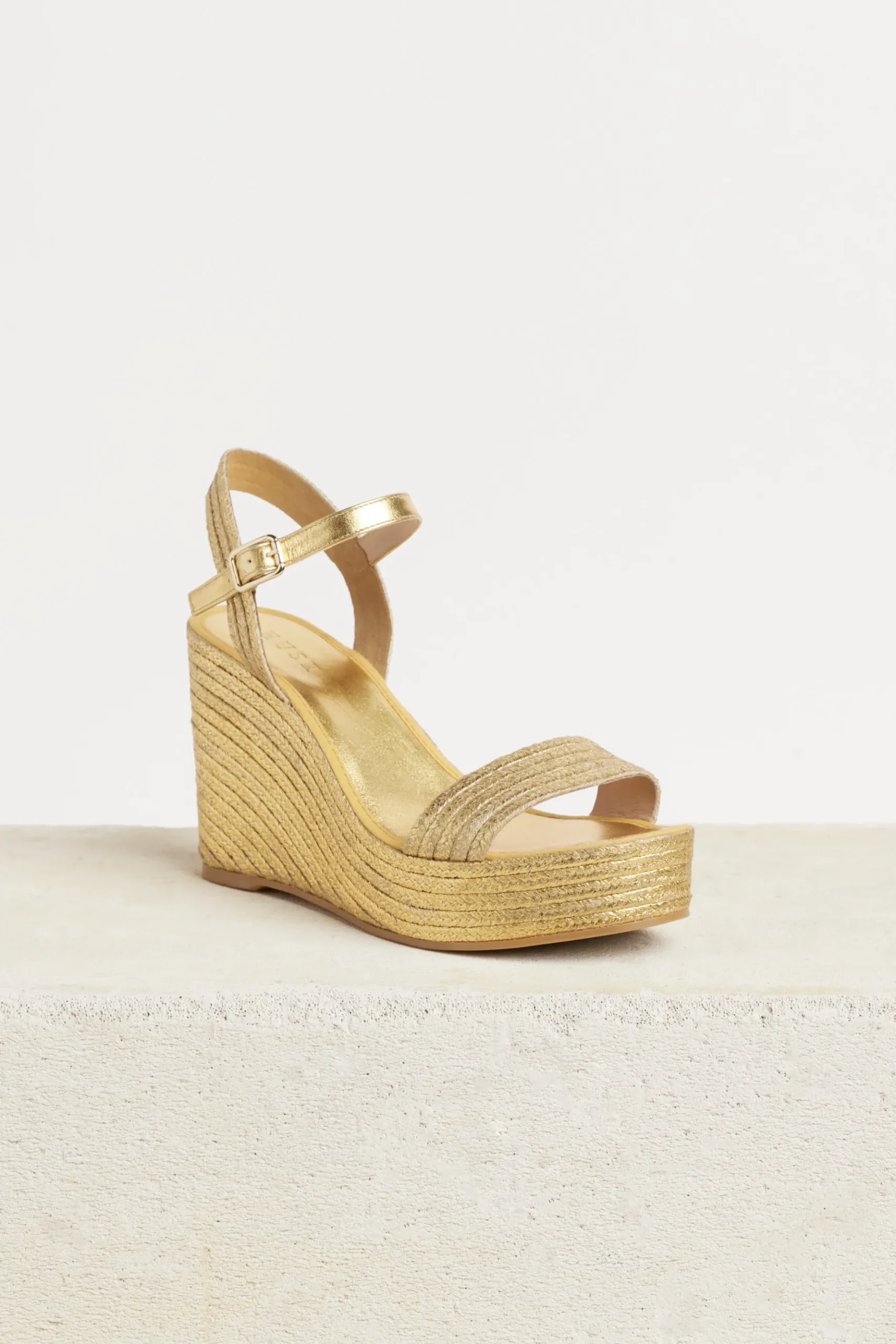 Elevate your summer style with the Husk ADELA ESPADRILLE in Gold. The jute upper with a classic braided wedge, brings a touch of sophistication to your ensemble. This espadrille features an almond toe shape, leather insole and lining. Heel height: 11cm Composition: Jute upper / Leather insole and lining / Rubber sole Made in Spain.