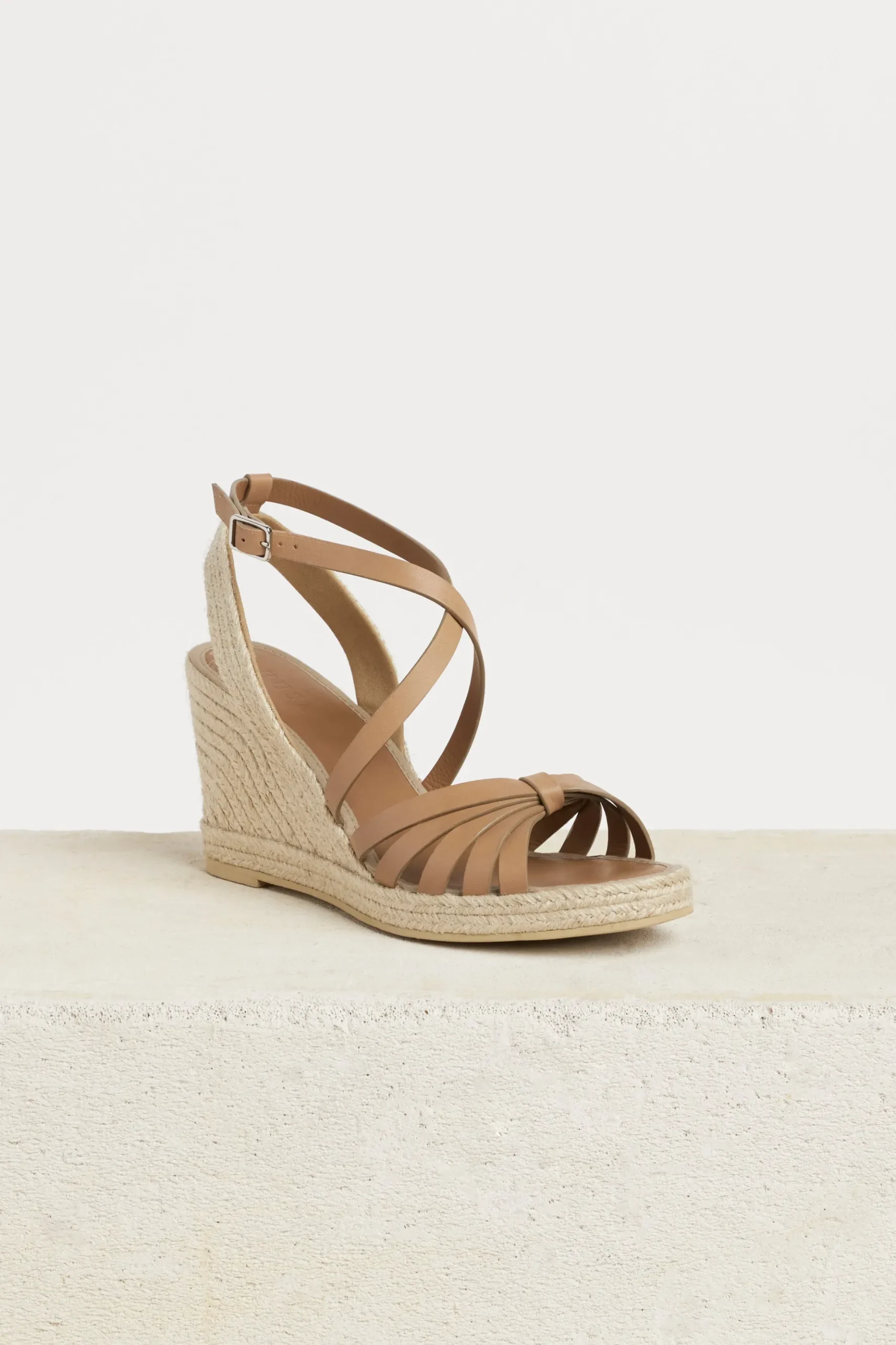 Elevate your summer style with the Husk DAHLIA ESPADRILLE. Crafted with a luxurious leather upper and adorned with thin crossover straps, these sandals exude sophistication. The classic braided jute sole and almond open toe add a touch of elegance. Available in Nougat and Nutmeg. Heel height: 9cm Composition: Leather upper / Leather insole and lining / Rubber sole Made in Spain.