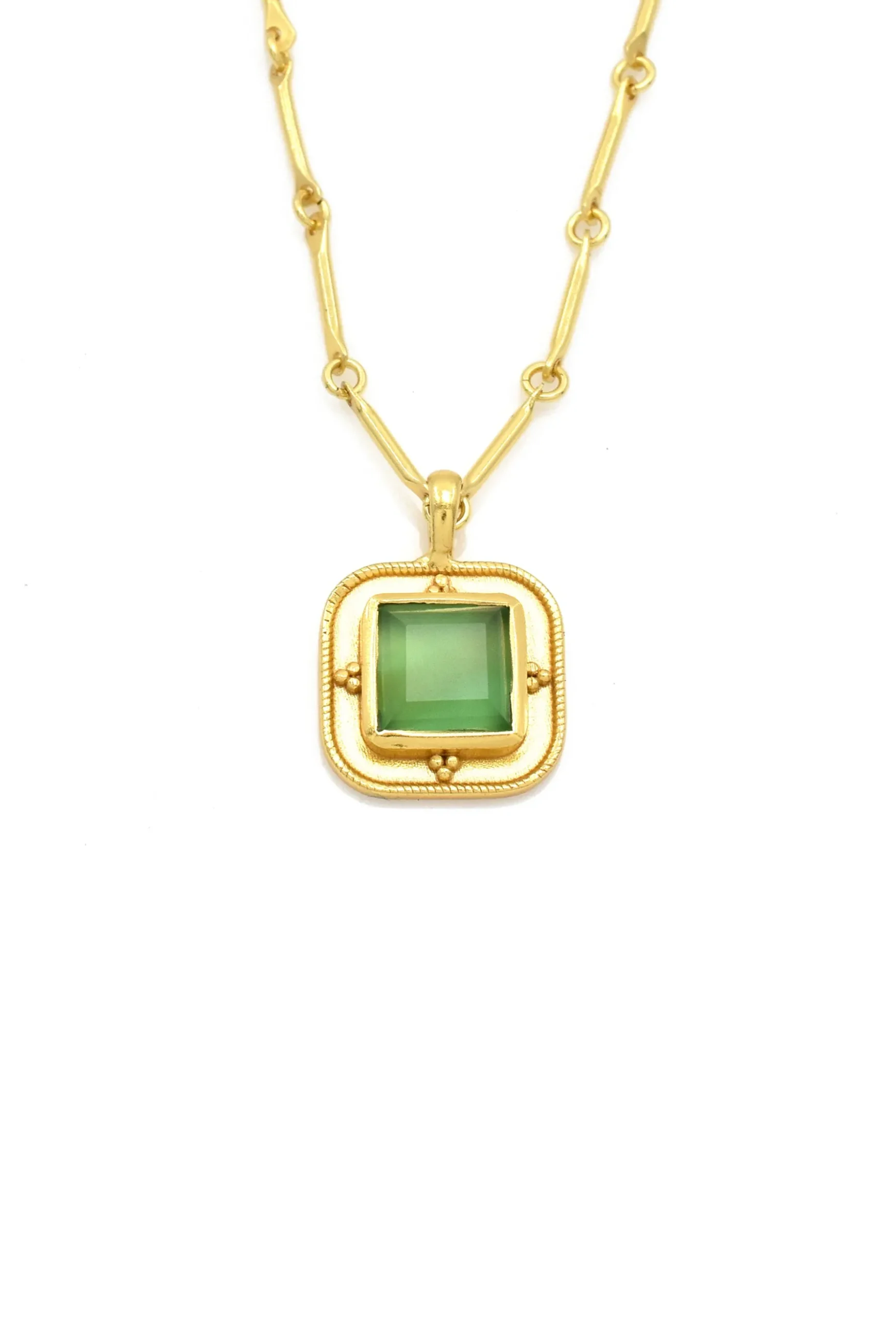 The Freida Necklace features a gold pendant with a large emerald stone at the centre of the design. Composition: 925 Sterling Silver / 3 Micron Gold Plate / Emerald Care instructions: Avoid wearing jewellery whilst swimming or bathing. Avoid having jewellery come into any contact with chemicals. Made in Jaipur, India.