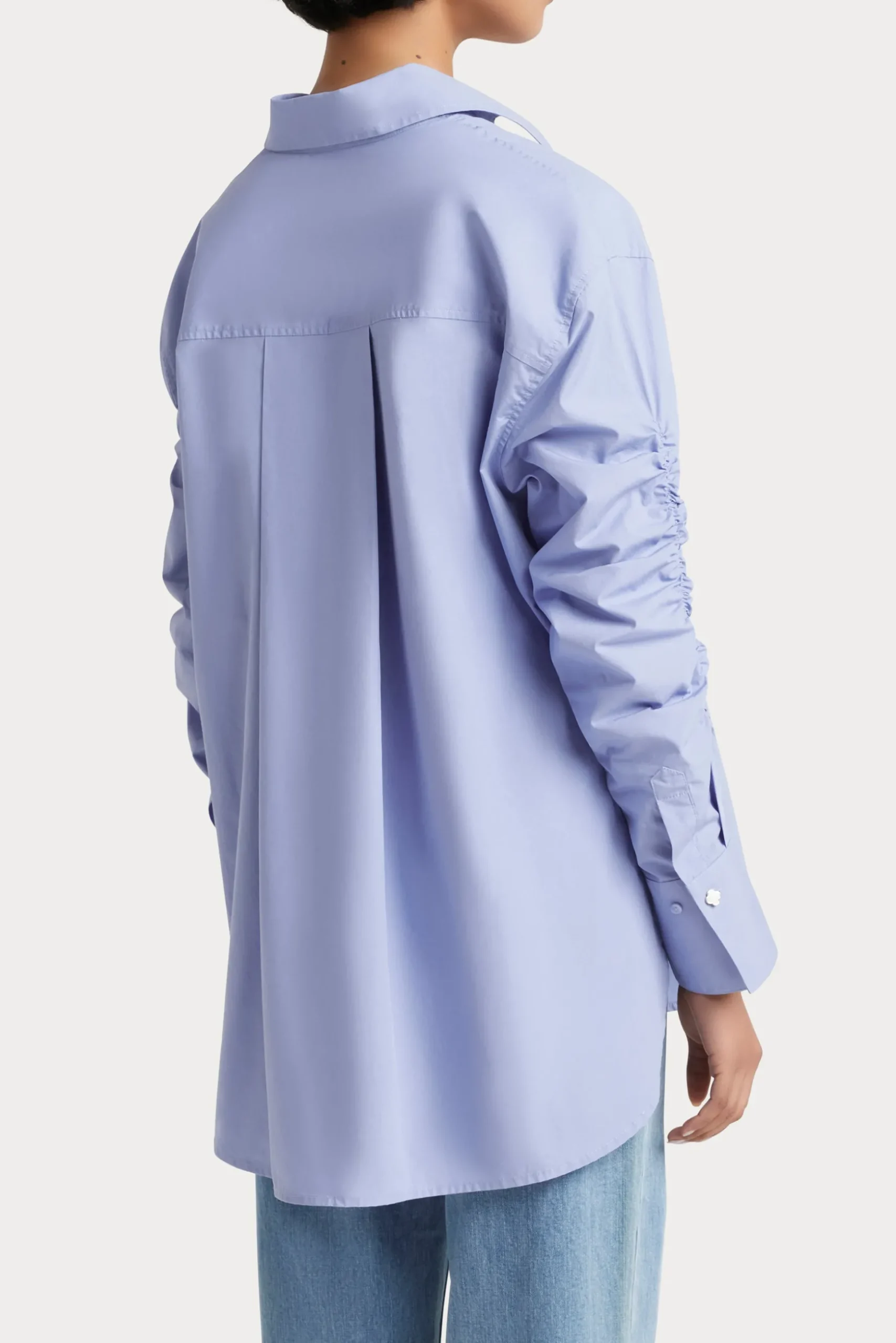 |Cut in a blue and white striped cotton |Collar with button down closure |Ruched sleeve detail created by internal elastic |Clover button detail on the collar stand and cuffs |Oversized shirt fit with long sleeves Composition 100% Cotton Care Dry clean Studio model is 177cm tall and wears a AU8
