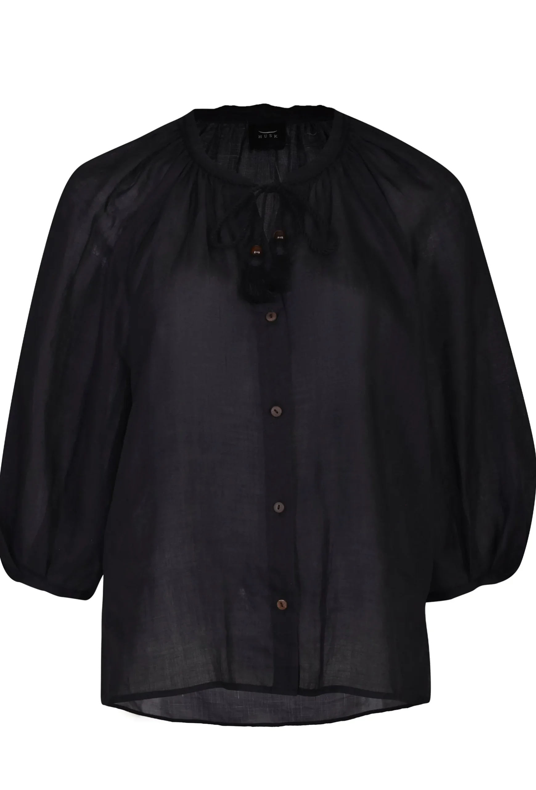 |Nehru collar |Rope tie and tassel detail with bead |Raglan puff sleeve with gathers into neck and sleeve cuff |Button down opening with coconut buttons Composition Ramie Care Dry clean Studio model is 177cm tall and wears a AU Size 8 / Small