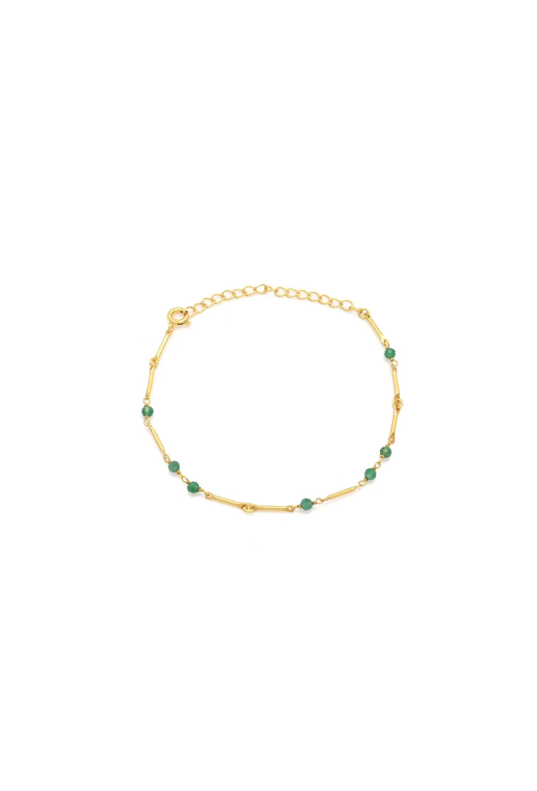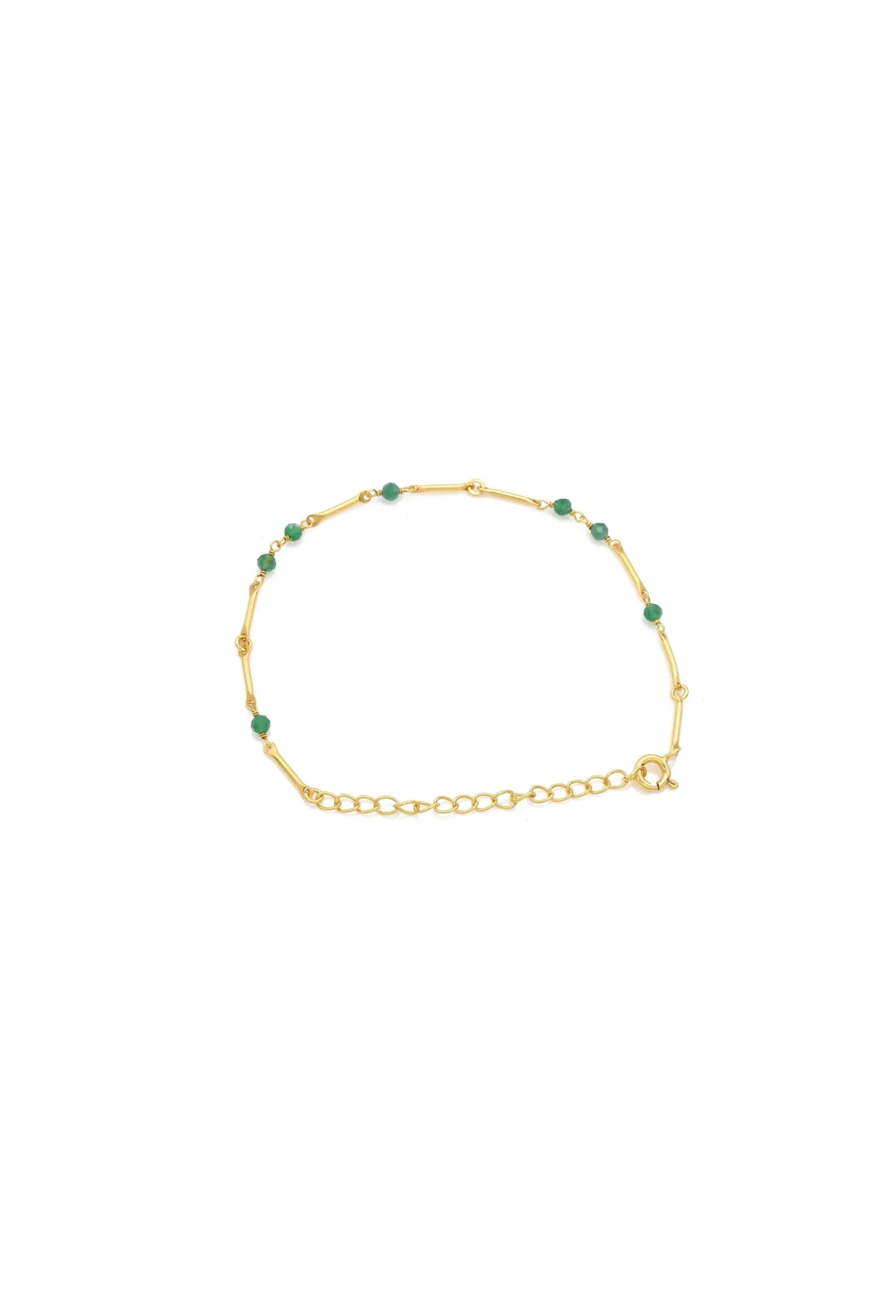 The Oli Bracelet features petite emerald beads amongst a fine gold plated chain. Composition: 925 Sterling Silver / 3 Micron Gold Plate / Emerald Care instructions: Avoid wearing jewellery whilst swimming or bathing. Avoid having jewellery come into any contact with chemicals. Made in Jaipur, India.