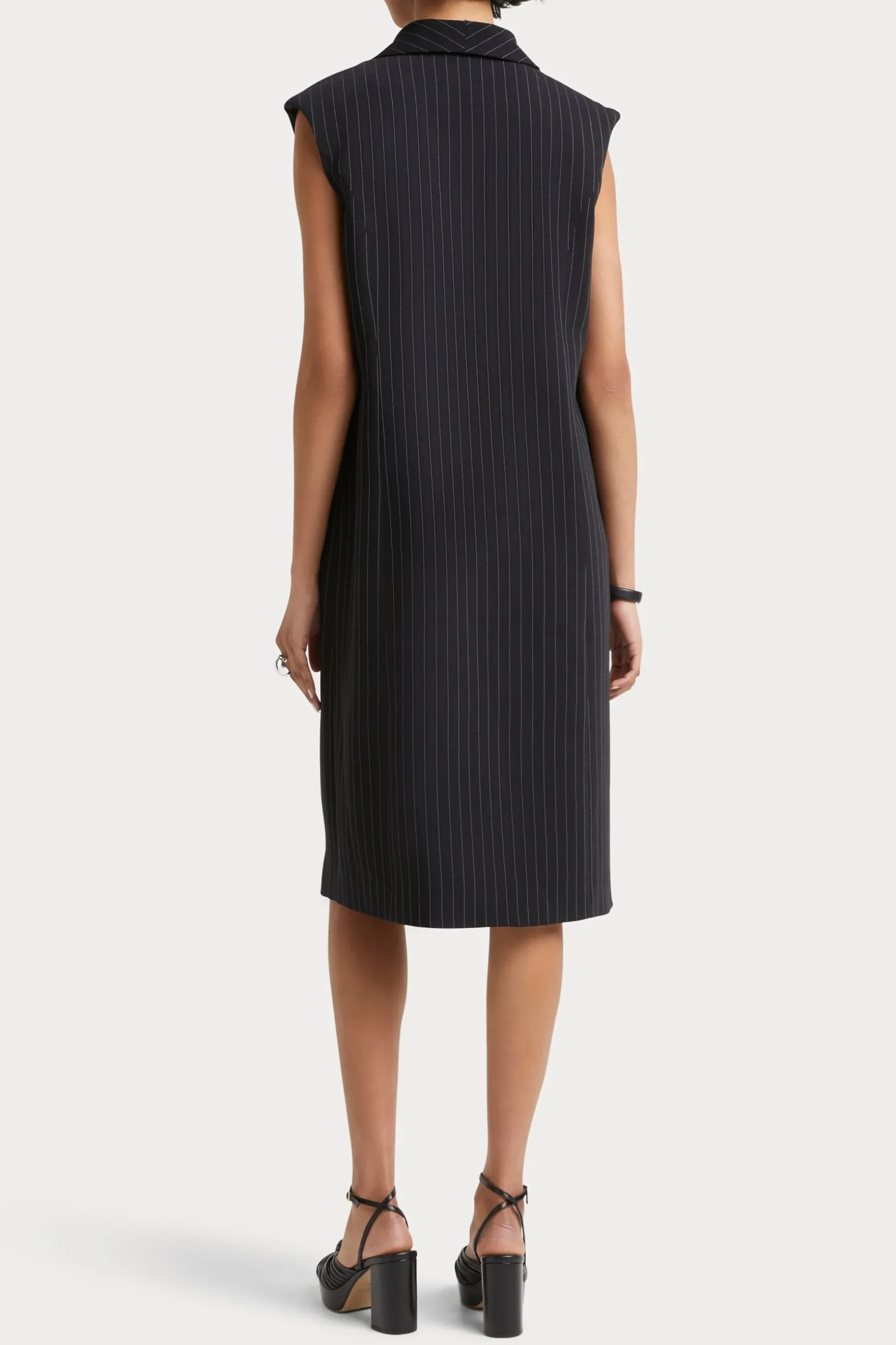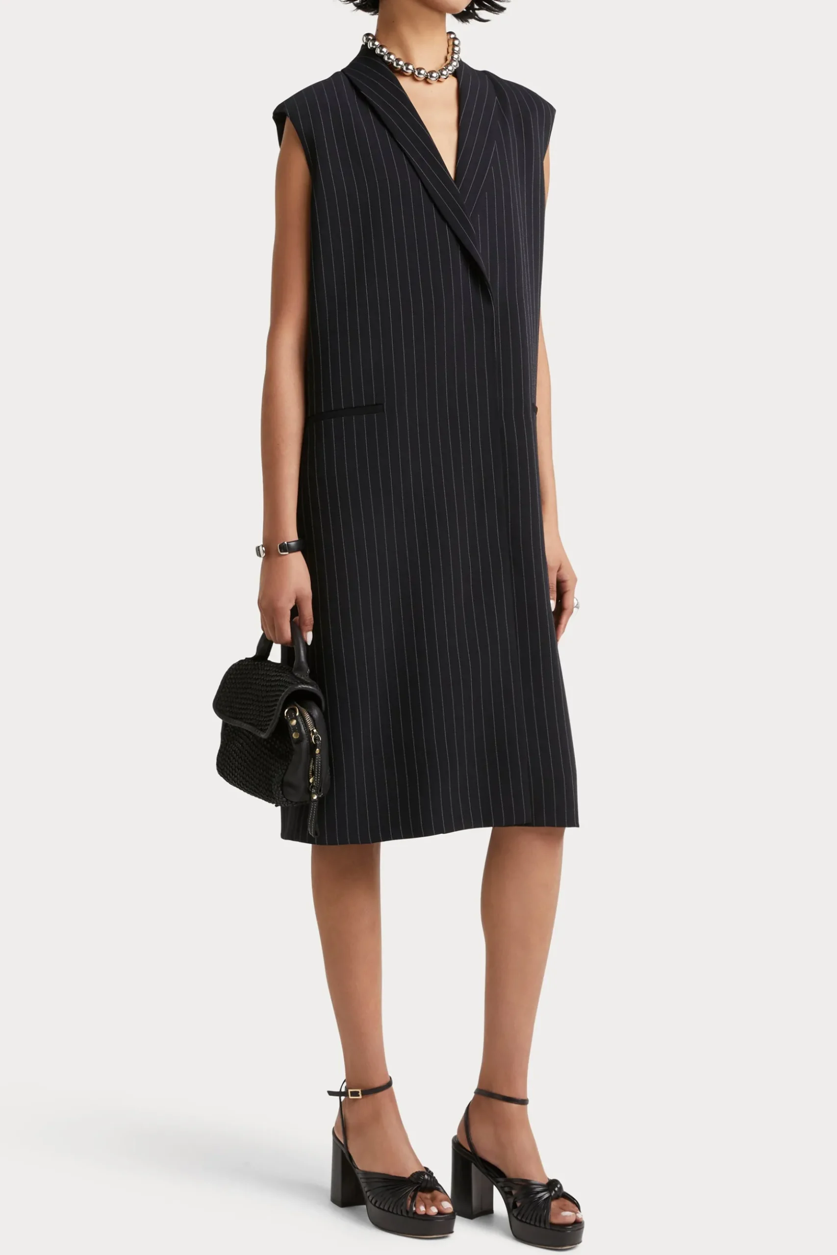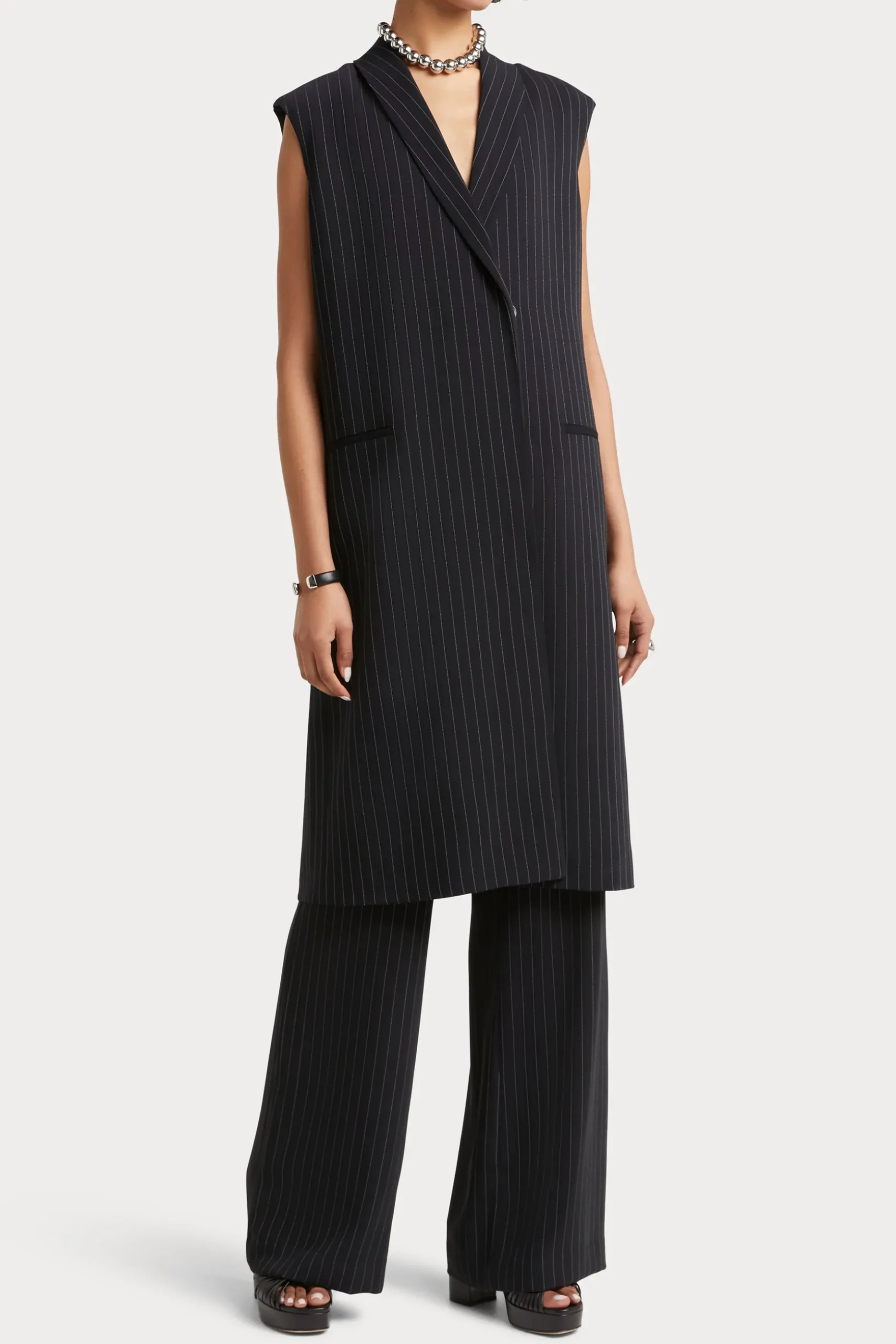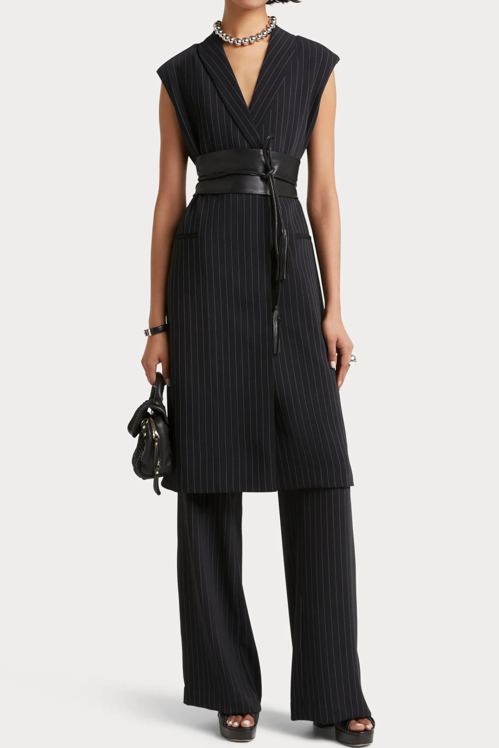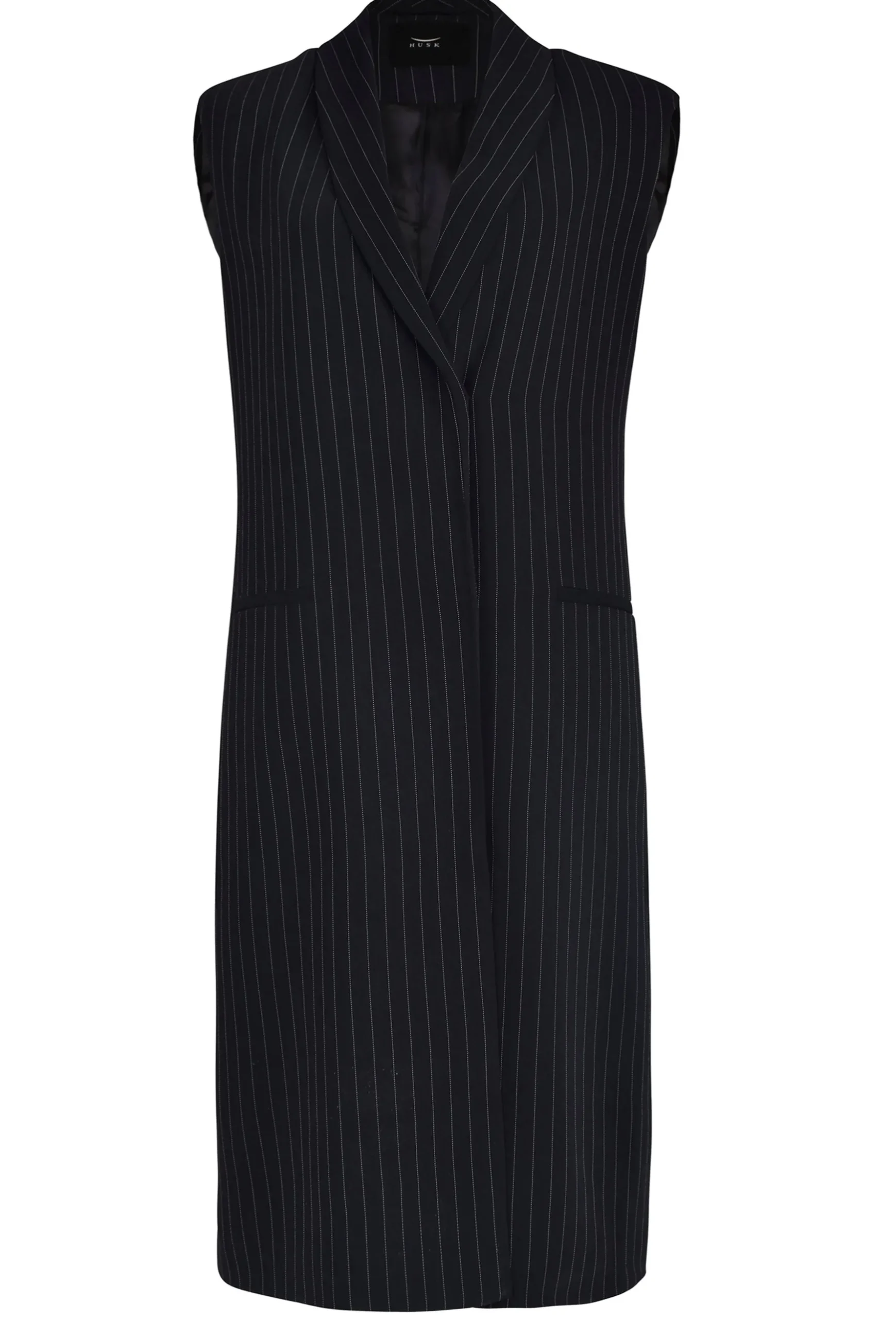 |Shawl lapel gilet |Can be worn as a dress or vest |Concealed snap button closure |Welt pockets |Slightly oversized shoulders with soft shoulder pad |Pinstripe material |Includes self-tie belt with gold d-ring closure Composition 99% polyester 1% Viscose Care Dry clean Studio model is 177cm tall and wears a AU8