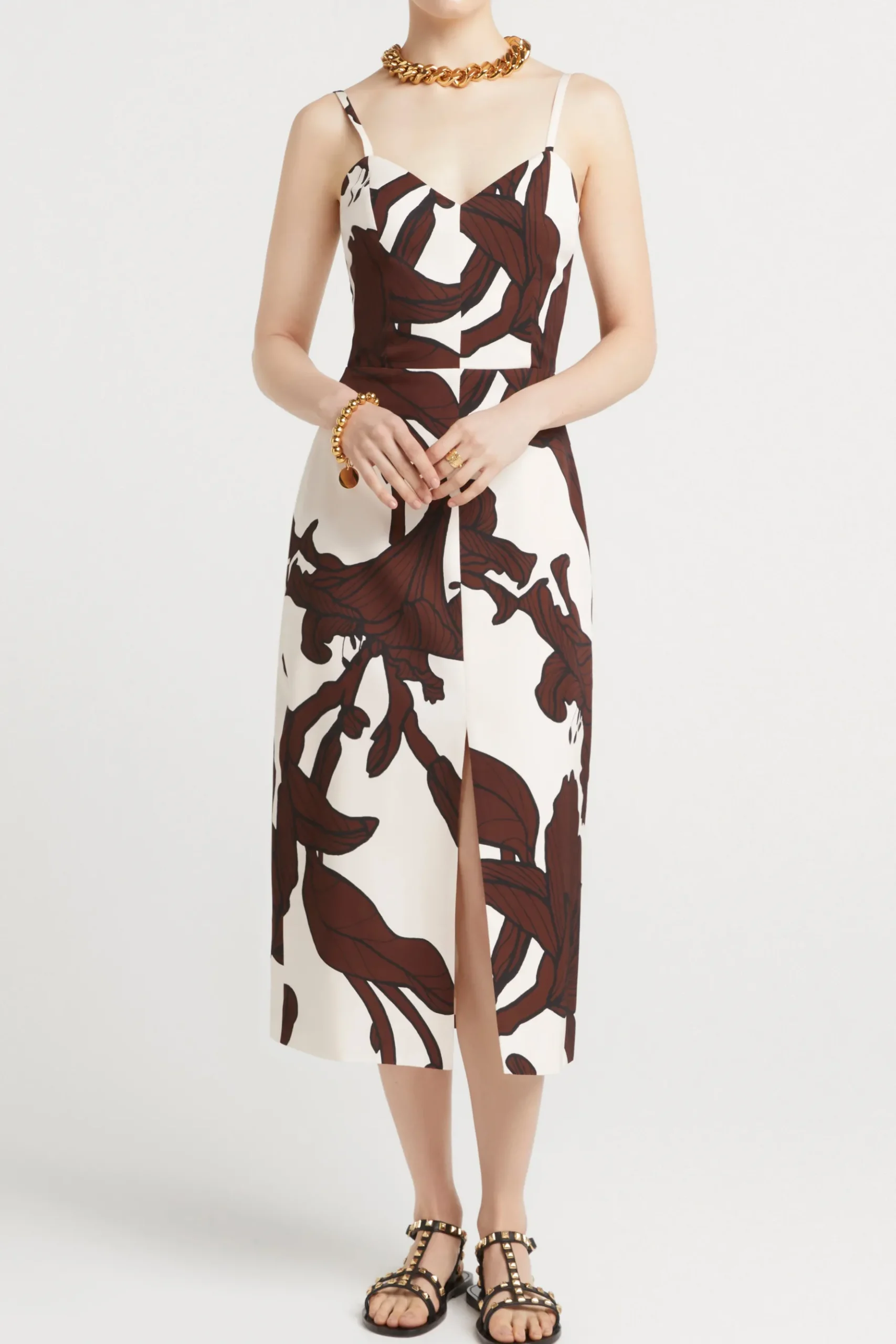 |Sweetheart neckline with adjustable straps |Midi length column silhouette |Centre front split |Fitted through the body |Centre back invisisible zip |Shirred side back panel Composition 100% Viscose Twill Care Dry clean Studio model is 177cm tall and wears a AU Size 8 / Small This style is on Pre-Order for an early November Delivery
