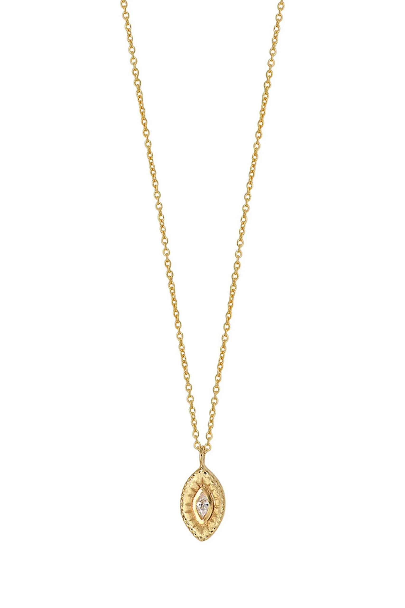 The Pillar Necklace features an eye medal which is engraved, brushed and set with a marquise-cut zircon. Composition: Sterling Silver / Gold Plate / Zircons Dimensions: 42cm length + 3cm extension Care instructions: Avoid wearing jewellery whilst swimming or bathing. Avoid having jewellery come into any contact with chemicals. Handcrafted in Paris, France.