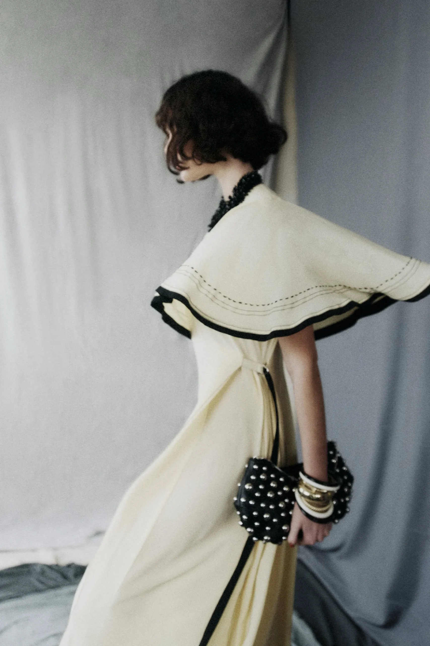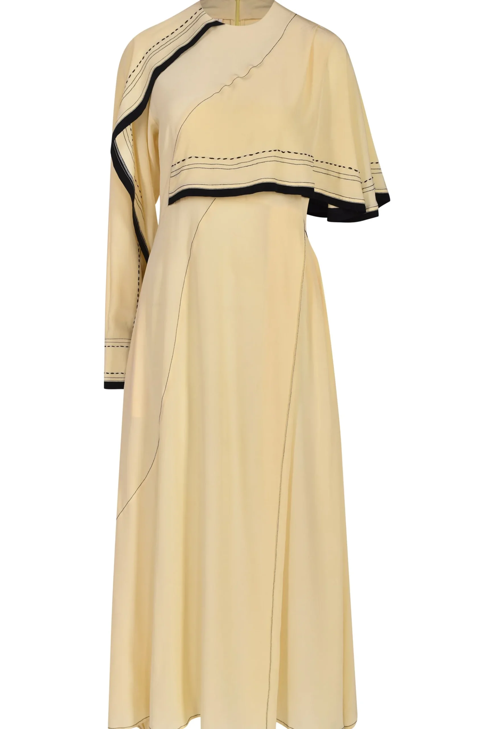 Indulge in the beauty of the Lovebirds Blossom Dress in Lemon. The soft, airy silhouette of the cape adds a touch of elegance, while the contrasting black stitching adds a modern edge. Composition: 100% Silk Crepe Care instructions: Refer to care label attached to the garment. Model is 177cm and wears size S