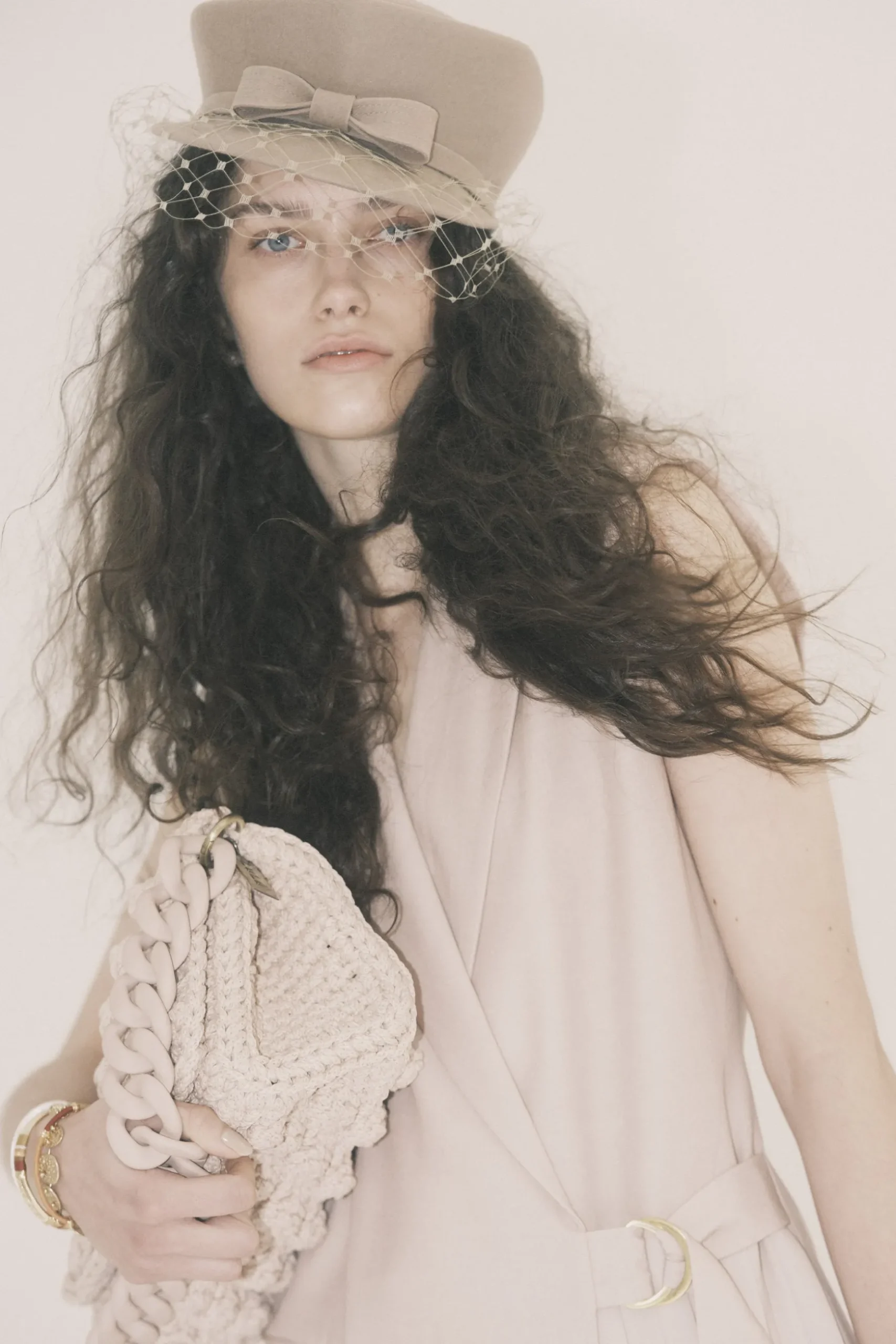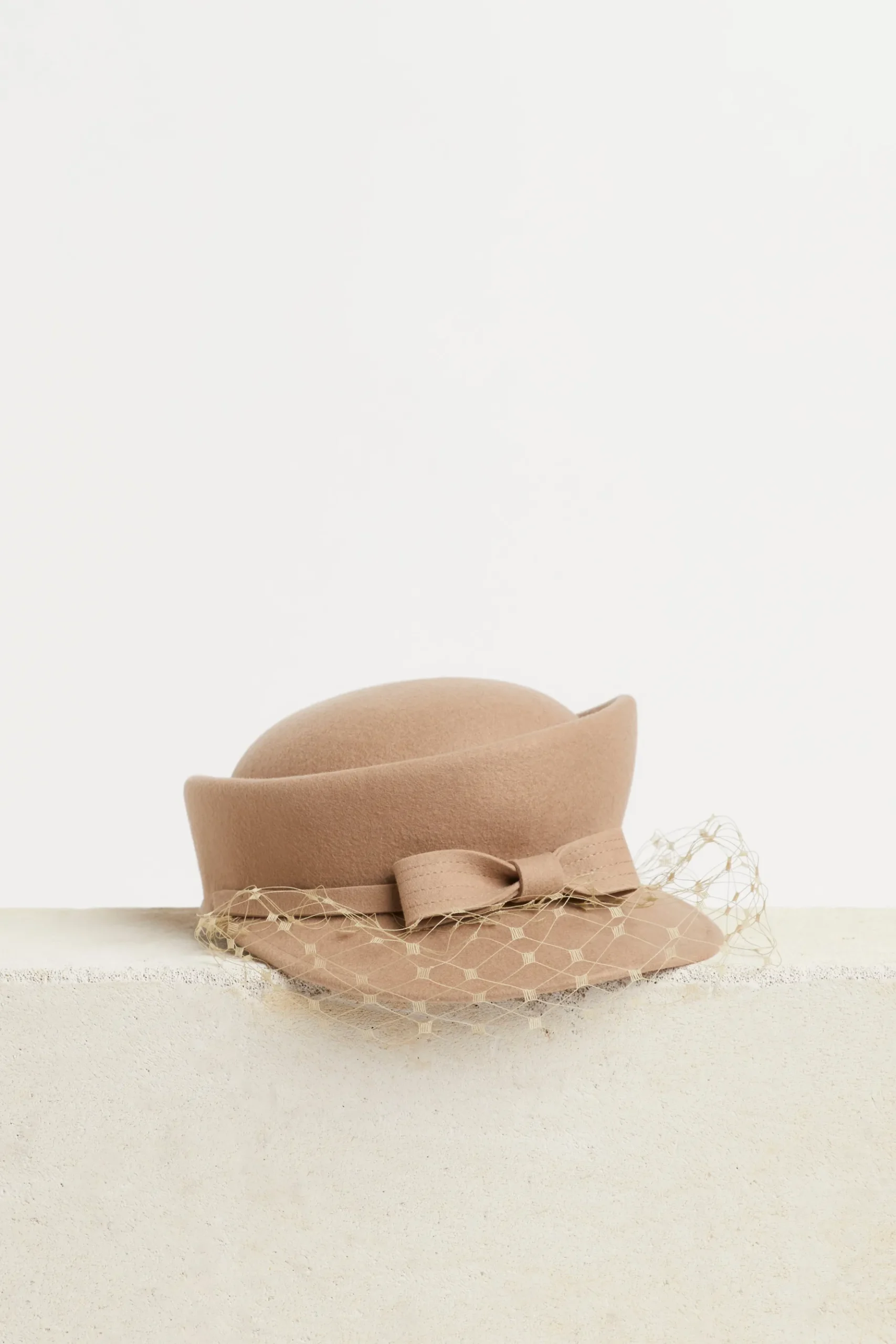 Asymmetric cap in light beige wool felt with veiled peak. Composition: 100% Wool Dimensions: 58cm diameter Care instructions: The best way to clean your hat is with a damp cloth or baby wipe. Handmade in the United Kingdom