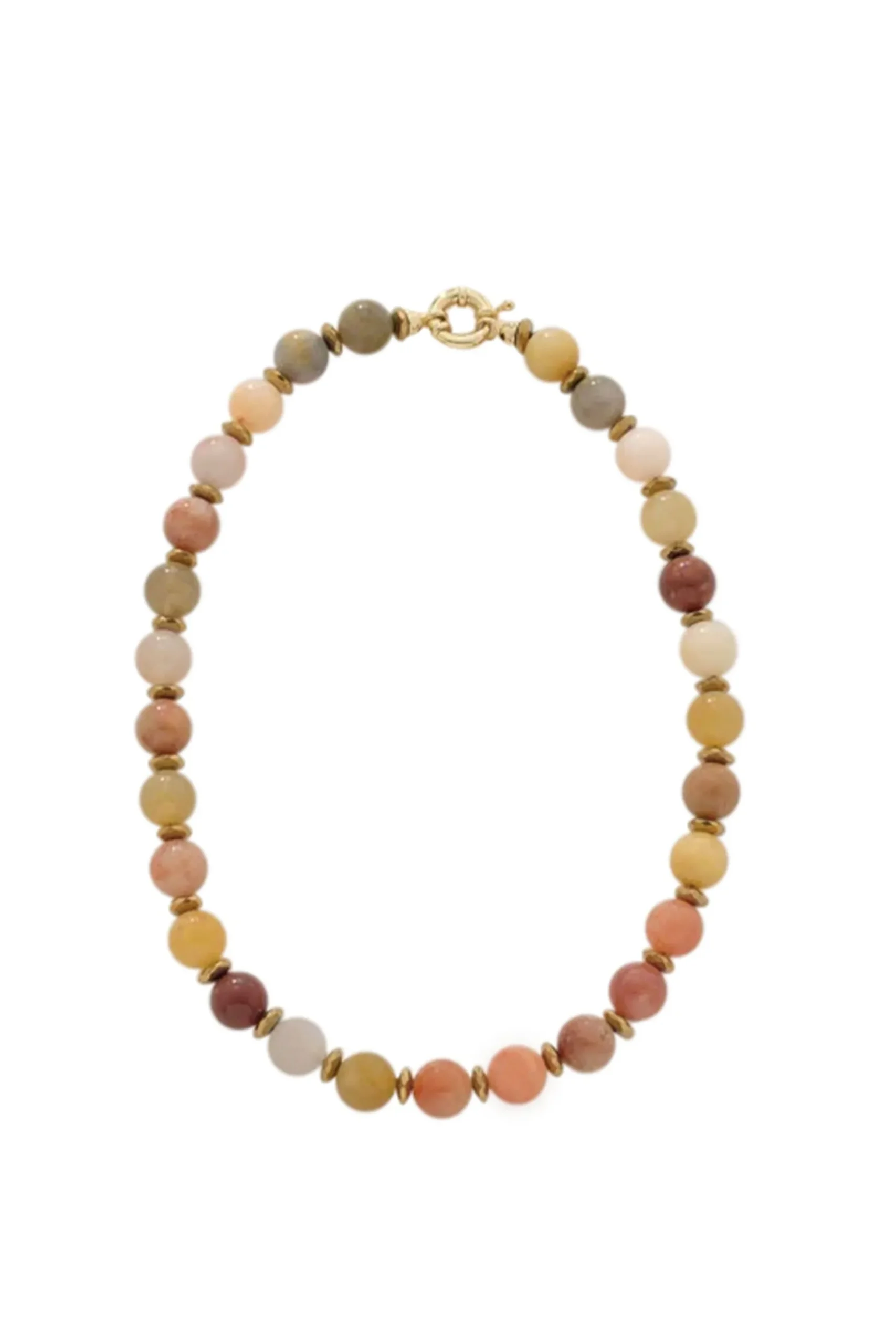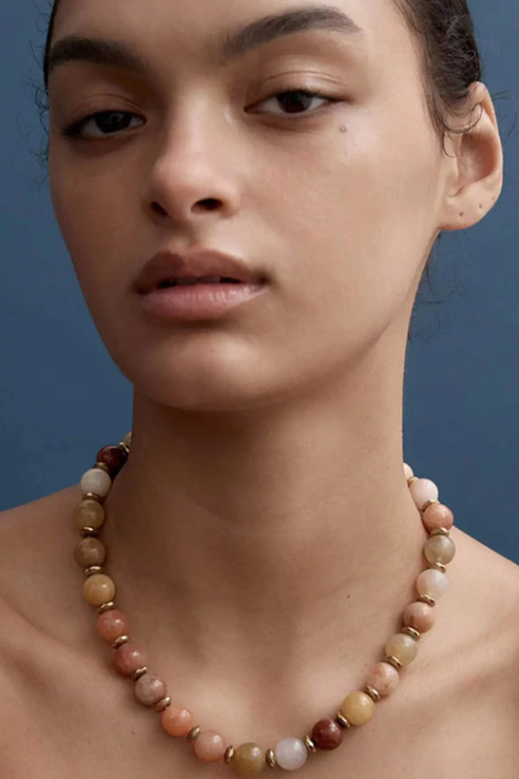 Ever in awe of nature's beauty, the Tuscany Necklace in Earth is an ode to the wonder, the power, the absolute force. Succumb to her magnetism with this string of natural gemstones and recycled material stoppers secured around your neck. Composition: Recycled brass base with 18KT gold plating & natural gemstones. Care instructions: Avoid wearing jewellery whilst swimming or bathing. Avoid having jewellery come into any contact with chemicals.