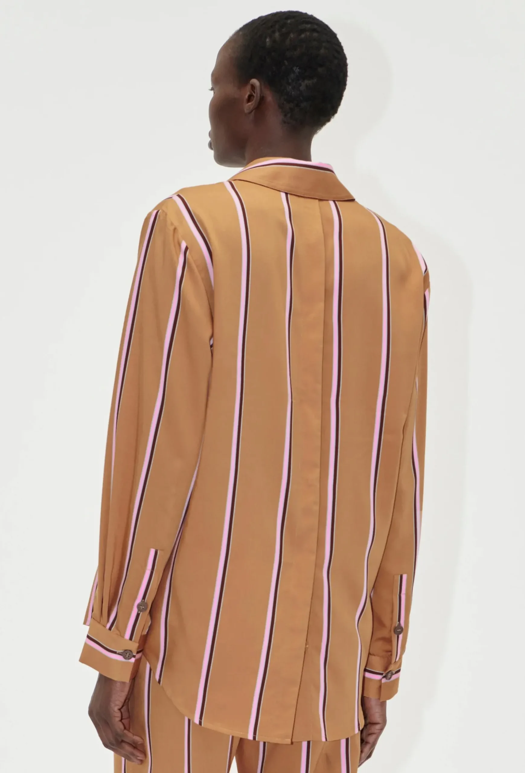 The Long Sleeve Shirt is a striped button-up shirt with a classic relaxed fit, collar and long cuffed sleeves with button fastenings. Pair with the gathered long pants to complete the look. Composition: 85% Ecovero Viscose / 15% Nylon Model is 178cm and wears size XS Care instructions: Refer to the garment for detailed washing instructions