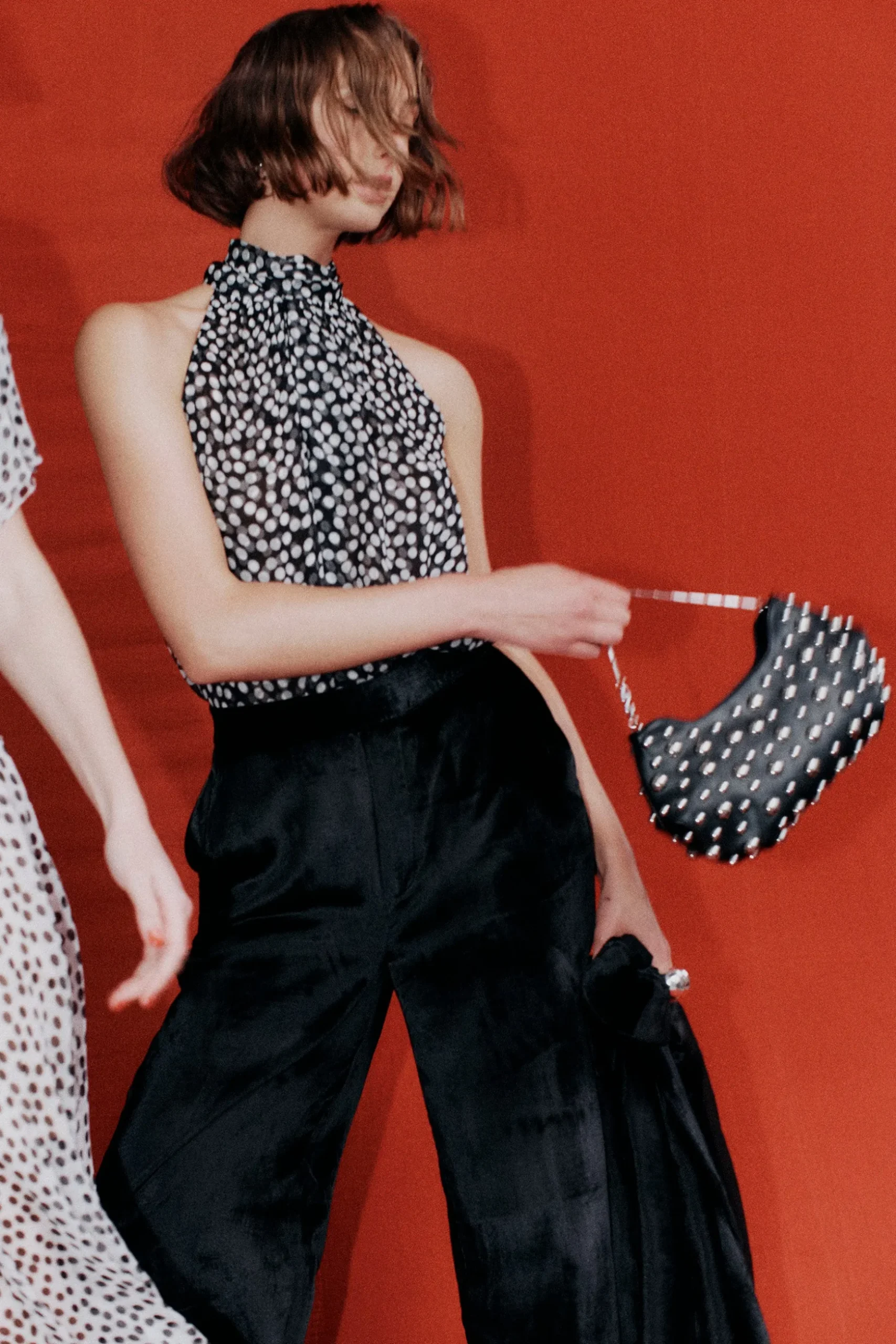 The Studded Satchel is a slouched shoulder bag made from soft apple leather with rounded metallic studs, a removable strap and a delicate top handle chain. Composition: 51% Recycled Polyester / 29% PU / 15% Biobased Leather / 3% Cellulose / 2% Carbonate Care instructions: It is recommended to keep the bag in a dry place and away from sunlight. Use a cotton or wool dry cloth over the leather to restore its beauty and shine.