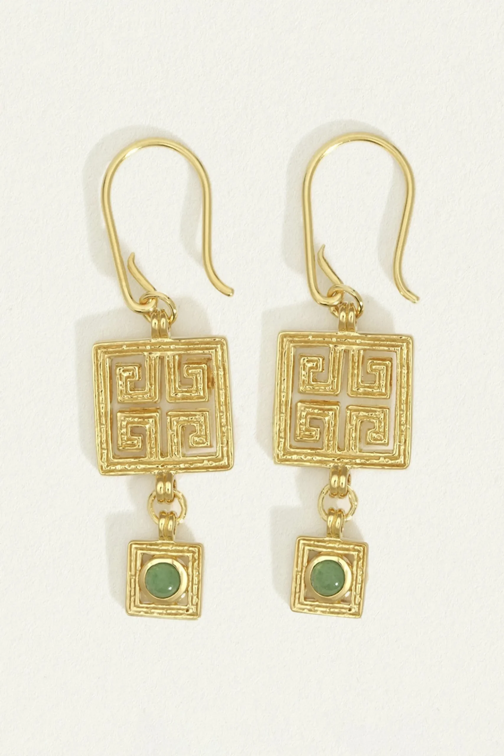 The Calise Earrings, in 18k gold vermeil, are statement earrings inspired by the enduring grandeur of Hellenic jewellery and architecture. Featuring a sumptuously textured Greek Key centrepiece |representing eternal flow, unity, and strength |is a green aventurine cabochon that exudes vibrant self-assurance. Composition: 925 Sterling Silver / 18K Gold Plate Dimensions: 4.8cm drop Care instructions: Remove jewellery before engaging in activities that may cause damage. Jewellery can be gently scrubbed with a soft-bristled or baby-sized toothbrush coated in warm, soapy water to dislodge any dirt.