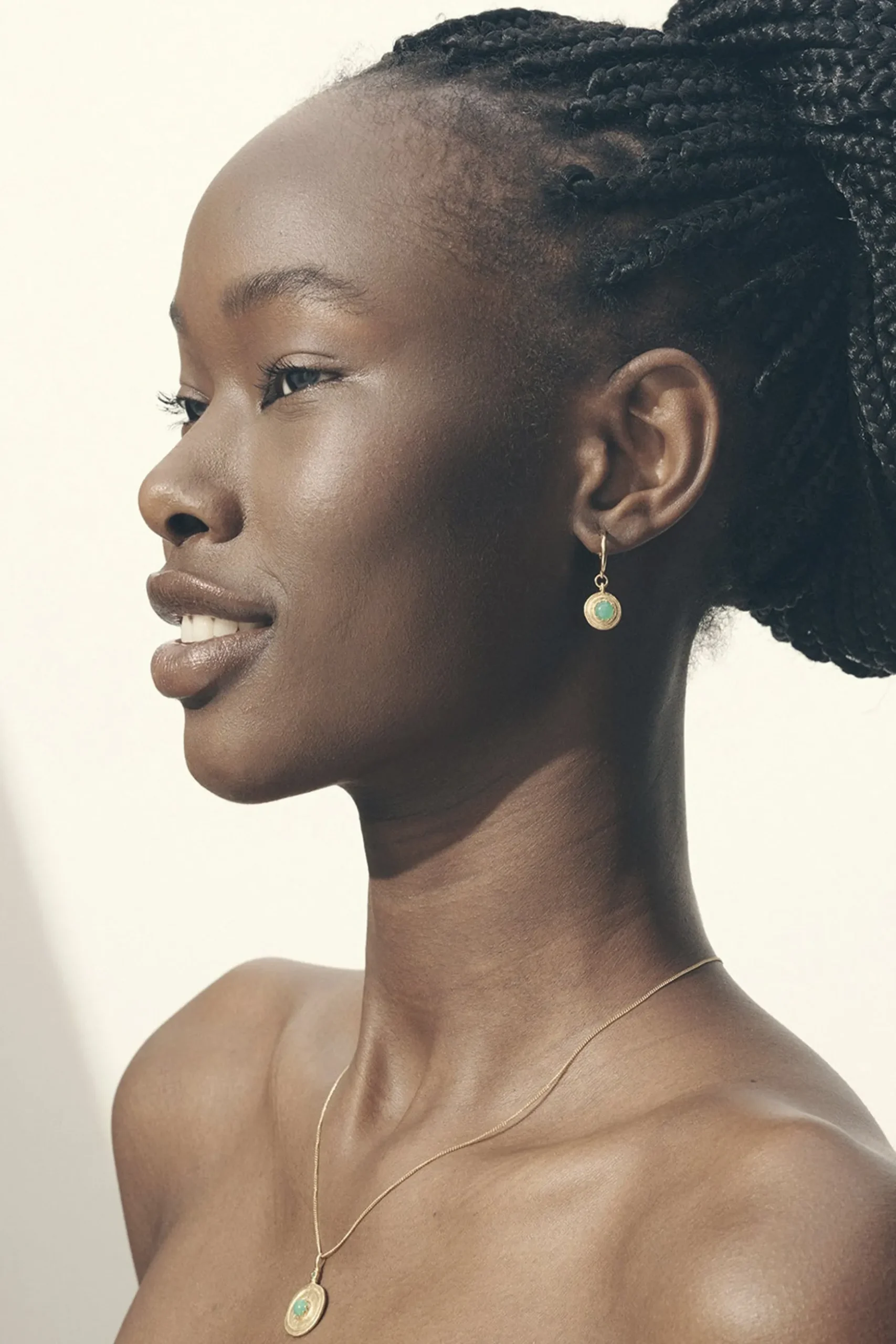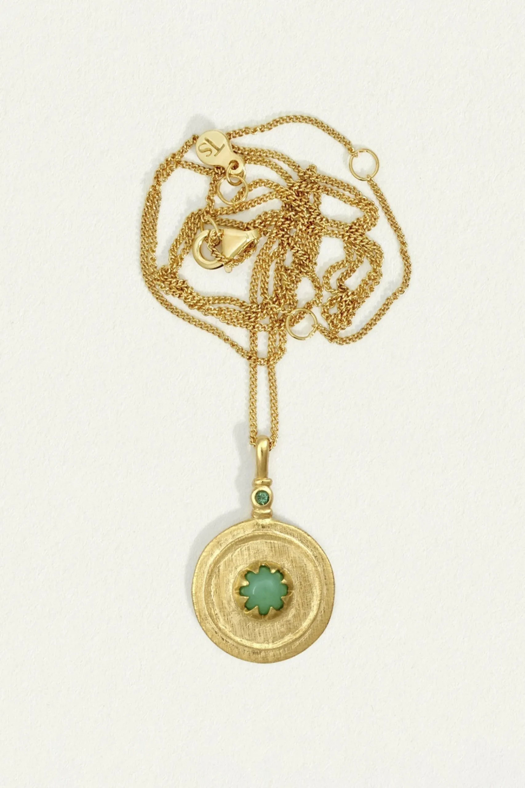 The Cora Necklace is a softly brushed coin necklace of 18k gold vermeil. The round pendant features an Australian chrysoprase gemstone set with a radiant star design, inspired by ancient Turkish, Bedouin and Berber jewellery. Composition: 925 Sterling Silver / 18K Gold Plate Dimensions: 45cm length + 9cm extension Care instructions: Remove gemstone jewellery before engaging in activities that may cause damage. Gemstone jewellery can be gently scrubbed with a soft-bristled or baby-sized toothbrush coated in warm, soapy water to dislodge any dirt.