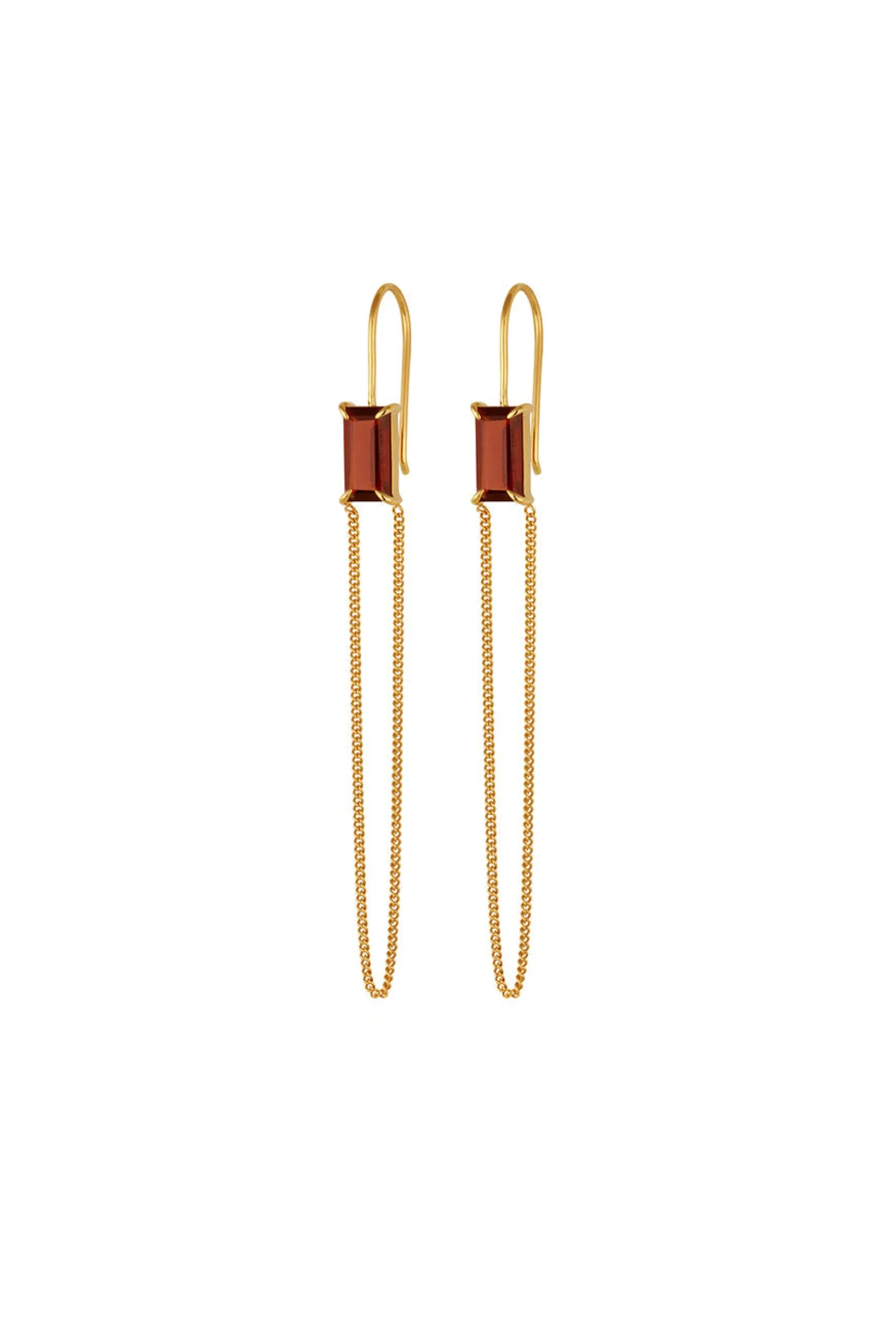 The Ember Earrings in 18K Gold Vermeil are inspired by royal crown jewels. A bold baguette-cut Garnet is held by a modern, minimal setting and contrasted with a delicate suspended curb chain drop. Composition: Sterling Silver / 18K Gold Plated / Garnet Dimensions: 7.5cm drop Care instructions: Avoid wearing jewellery whilst swimming or bathing. Avoid having jewellery come into any contact with chemicals.